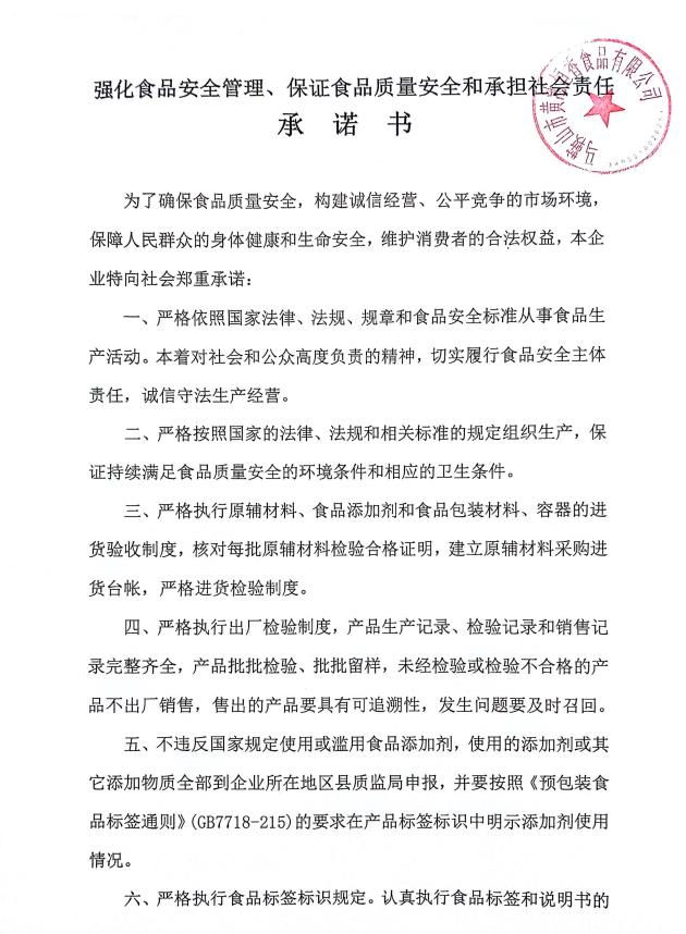 強(qiáng)化食品安全管理、保證食品質(zhì)量安全和承擔(dān)社會(huì)責(zé)任承諾書